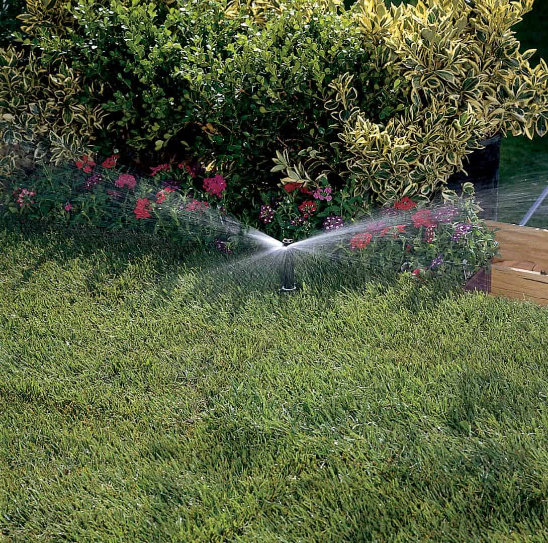 Irrigation nozzles are designed to spray from head-to-head, so you’ll want to space spray bodies so that their spray just reaches the next closest one. And you want to spray from outside in, specifically in the corners first, then fill the gaps. Yes, that means more sprinklers than simply positioning one unit in the middle, but positioning that way that means the compromise of either overspray or dry patches on lawn edges!