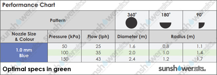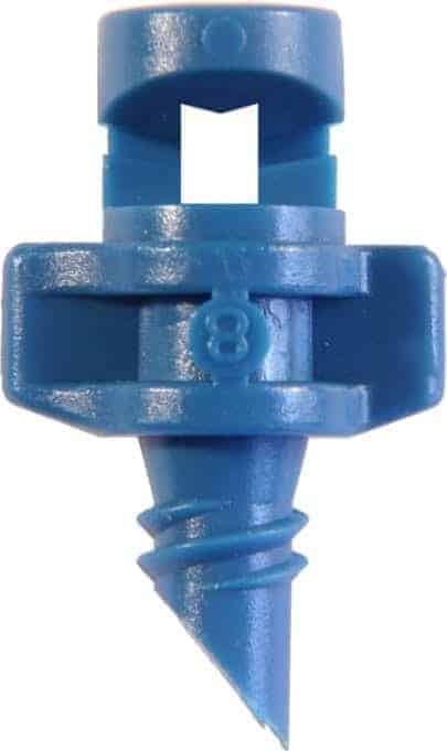 Economical fan spray jet for effective watering. The spray produced by this sprinkler is a very fine one, almost like a mist and is suitable for small garden beds. They can be connected to 4mm micro risers or larger 15mm risers with the use of a border jet adaptor.