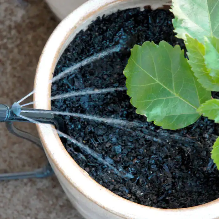 The Potstream® is a side mounted watering solution for potted plants and containers. The adjustable gentle stream pattern minimises soil erosion and the variable flow rate and pattern radius allow for use in various pot sizes.