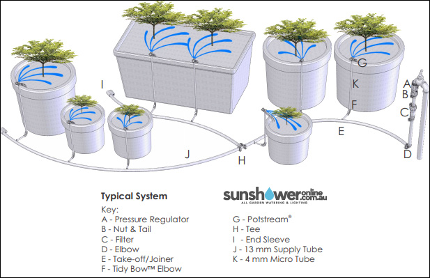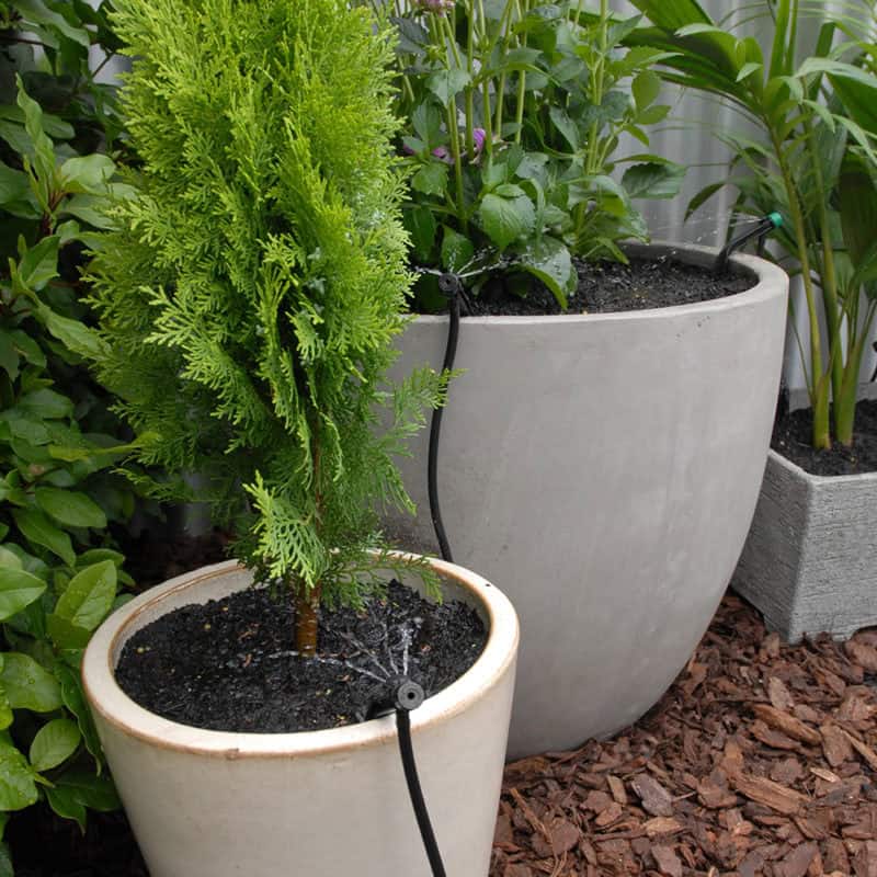 Micro Drippers are perfect for pots, but your challenge is delivering the water to the pot. We suggest you run Poly Pipe as close as you can & then thin Micro Tube as hidden from view as possible up into the pot.