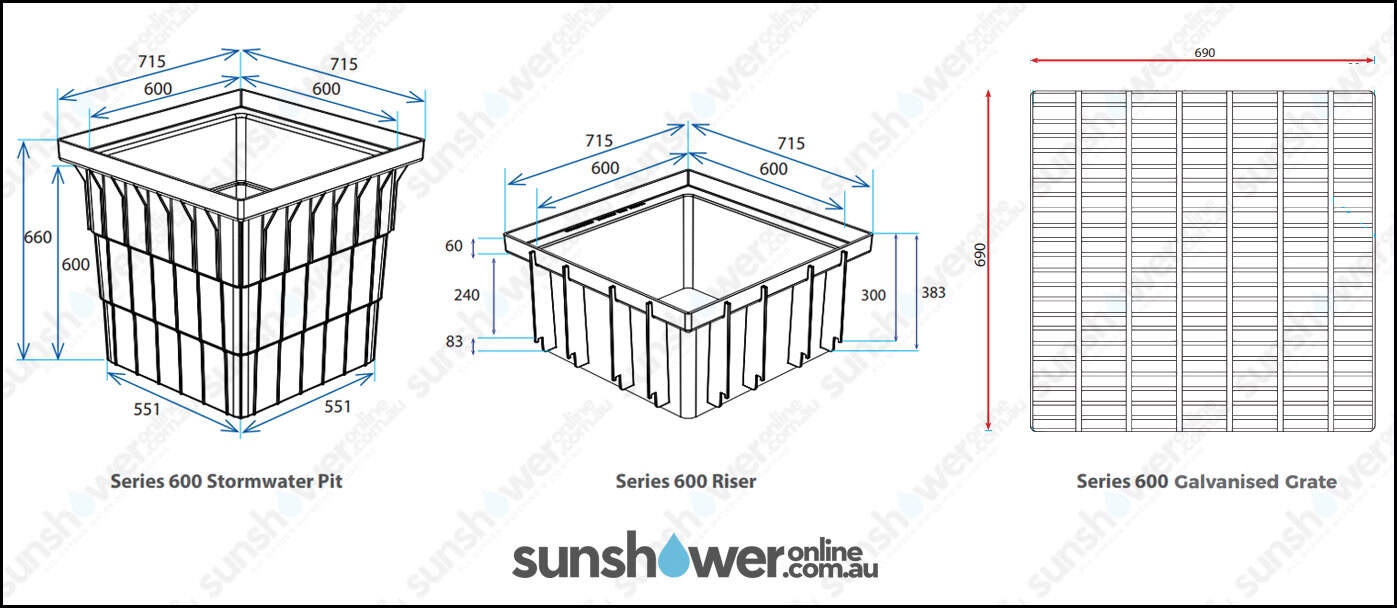| Everhard Series 600 Stormwater Pit | Everhard Series 600 Pit Extension | Everhard Series 600 Galvanised Grate | |