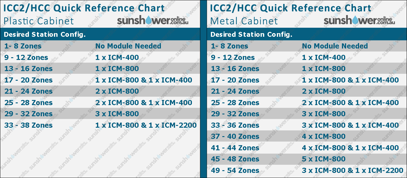 | Hunter ICC2 8 to 38 Zone Modular Controller (Plastic Cabinet) | Hunter ICC2 8 to 54 Zone Modular Controller (Metal Cabinet) | |