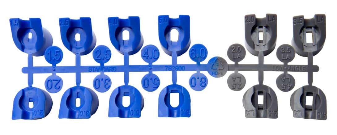 The standard blue nozzle rack comes with 8 blue nozzles and 4 grey low angle nozzles.