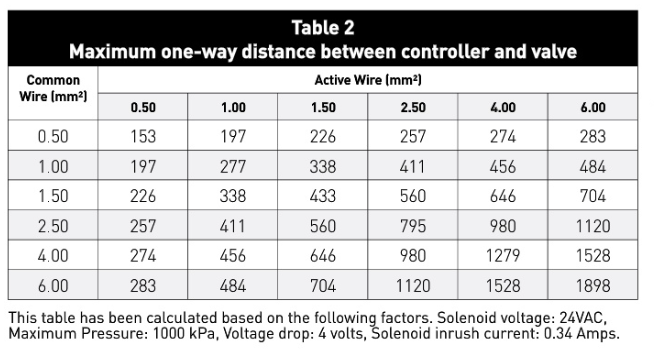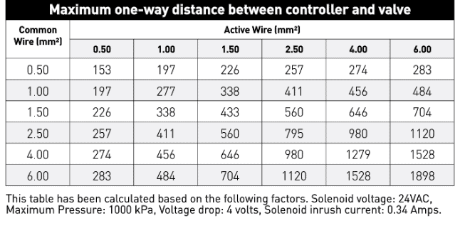 Select cable based on the number of valves (cores needed) & distance from controller to valves (to prevent voltage drop). At minimum the number of cores must allow for the number irrigation valves used, plus allocation for a common wire.