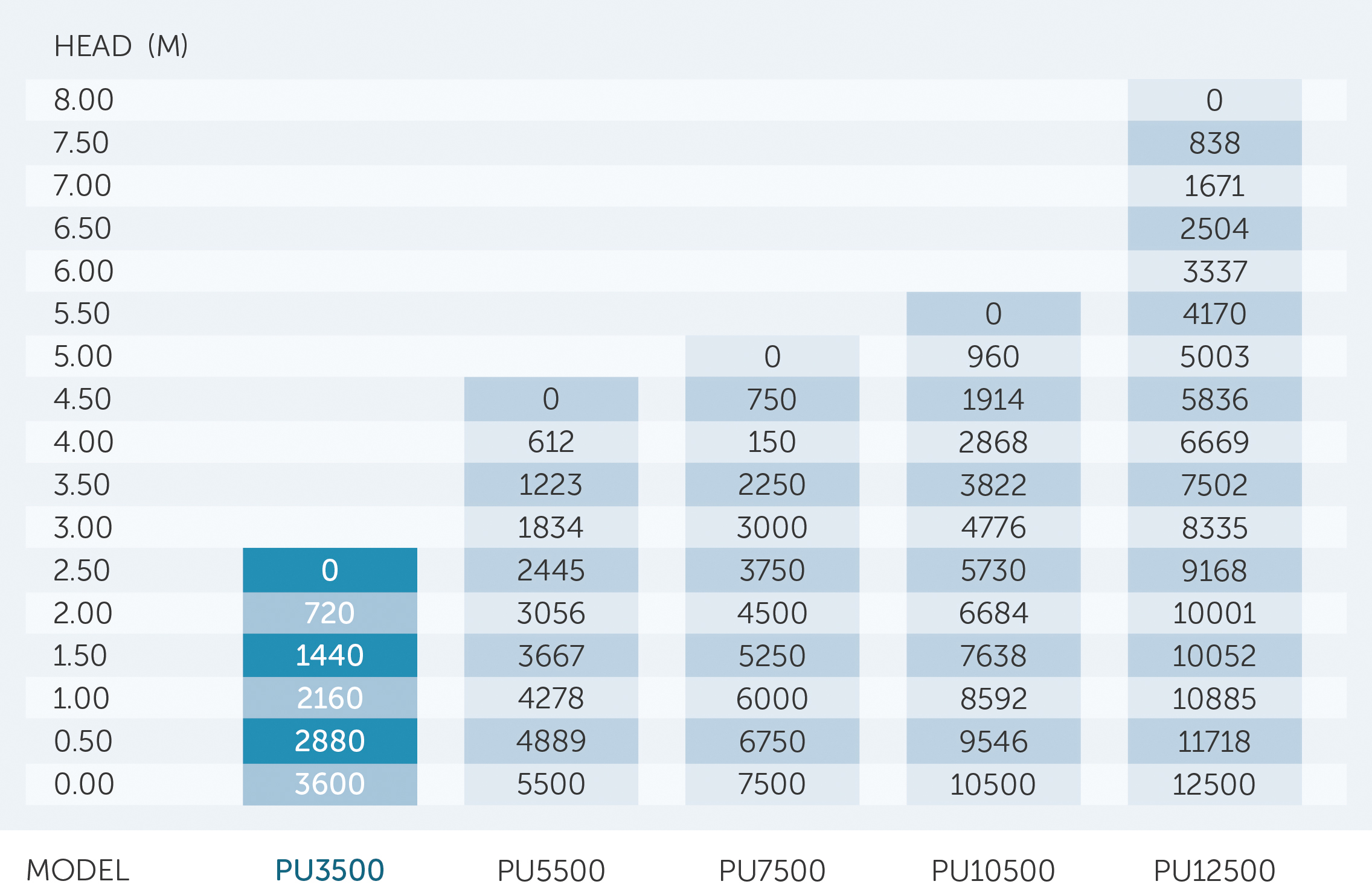 | Product Max. Flow Output (Lph) | 3600 | 5500 | 7500 | 10500 | 12500 | 17000 |