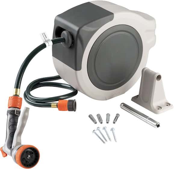 - Includes high kink resistance garden hose, hose end fittings, front trigger hand spray, inlet tap to reel hose, bracket and screws.