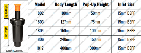 Note: Sprinkler sizing relates to pop-up height, not overall body size.
