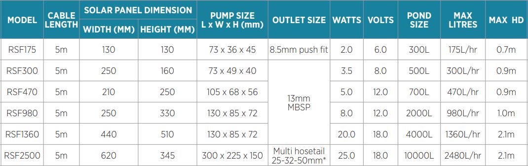 World-class solar technology is combined with high quality brushless pumps, to produce a great range. Manufactured to our design and quality requirements with superior technology solar panels for high performance and durability. These fountain kits have all the parts you need included, to suit most applications. The “Max Head” measurement is the maximum lift height in full sun. Models RSF300 and larger feature run-dry protection. Units operate in direct sunlight only.