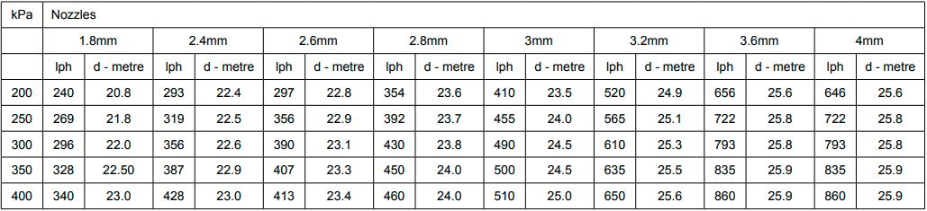 | Product Max. Spray Radius (m) | 11.7 | 12.0 | 11.7 | 11.7 | 11.7 |
