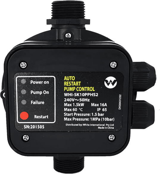The White International controllers are devices used to control electric 240V pumps of 1.5kW or less. The controller monitors both the pressure and the flow. It controls the operation of the pump automatically. Because of its design, there is no need for a separate pressure (expansion) tank, nor is there any need to adjust start and stop pressures as per traditional pressure switches. The unit will protect the pump should the water supply fail (due to blockage in the pipe or tank running dry) and will automatically restart normal operation once water is restored.